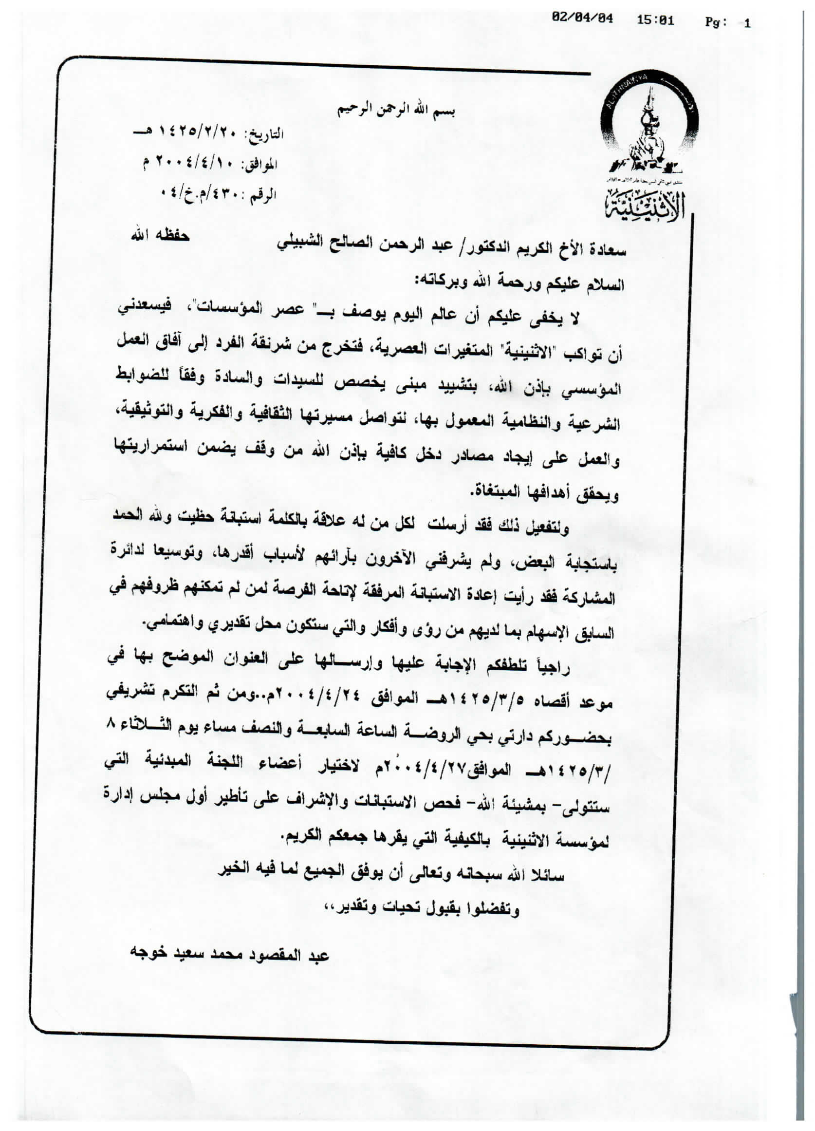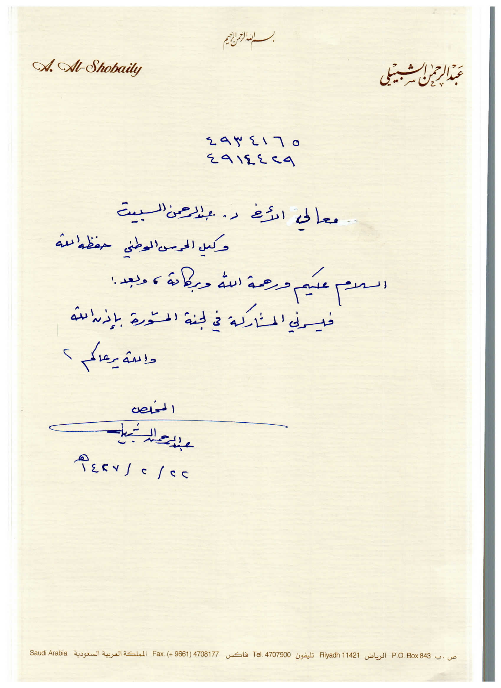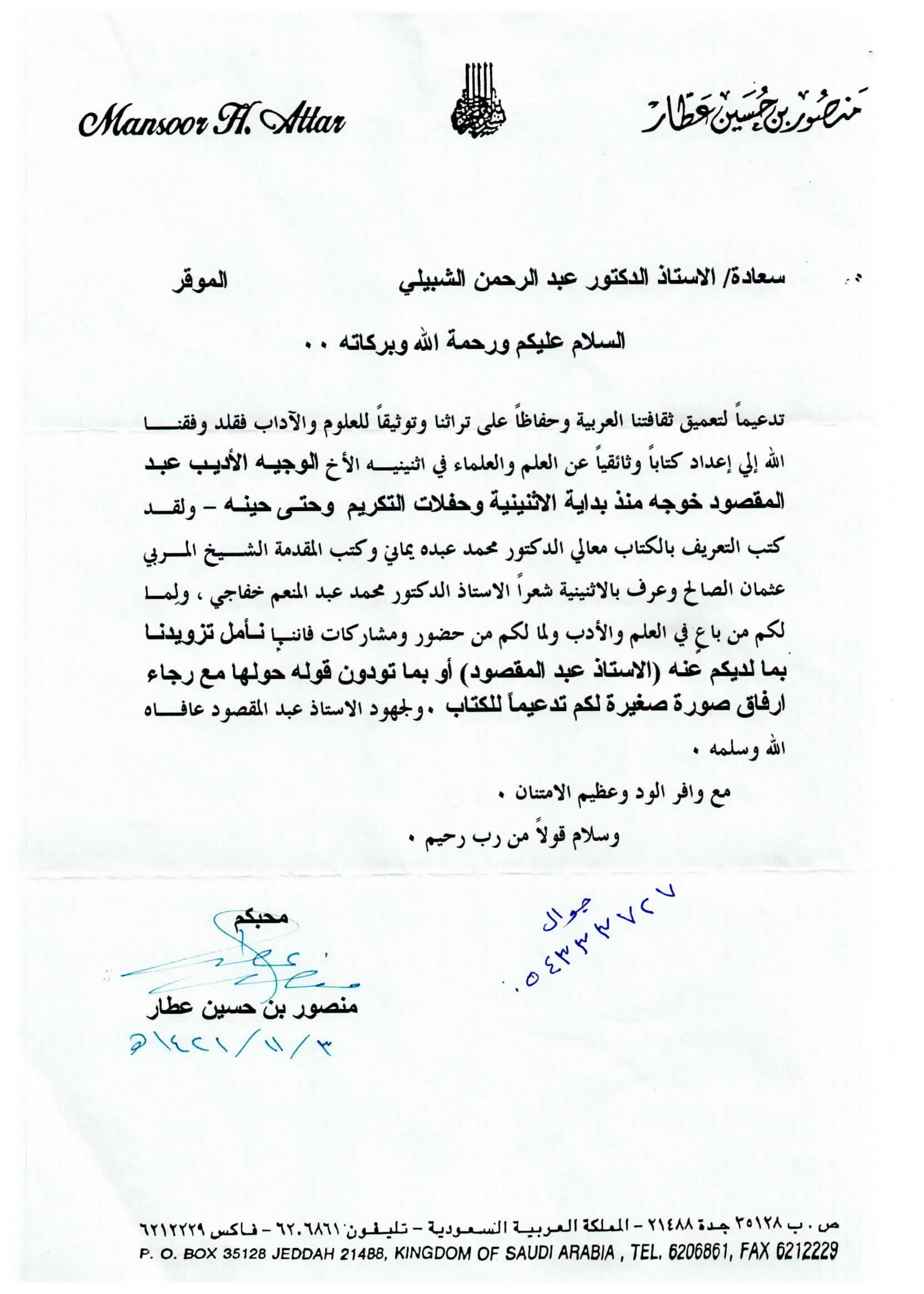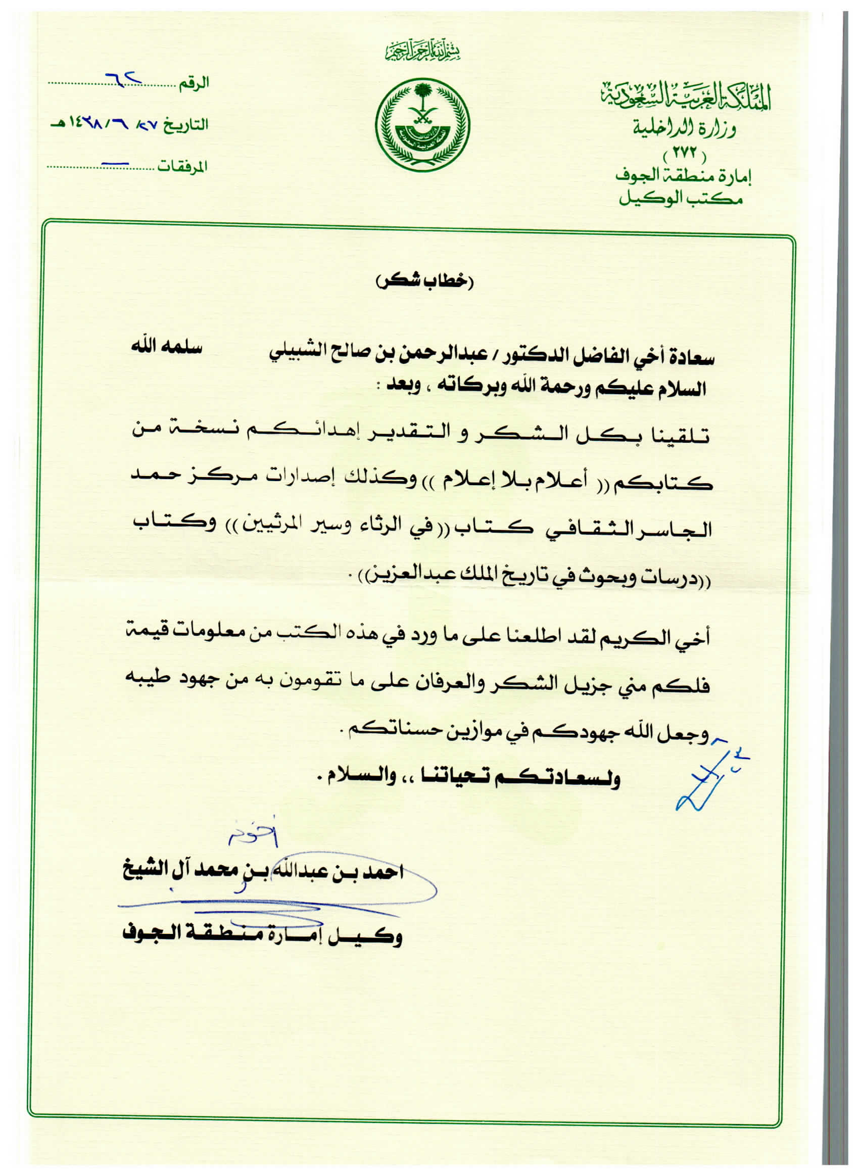 (العربية) خطاب للحرس الوطني بترشيخ الدكتور الخويطر للتكريم في الجنادرية